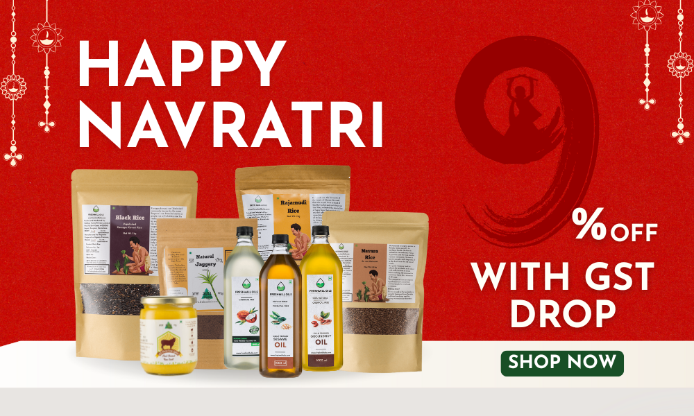 The dried seeds are then pressed in a wooden chekku to extract 100% pure woodpressed oils.