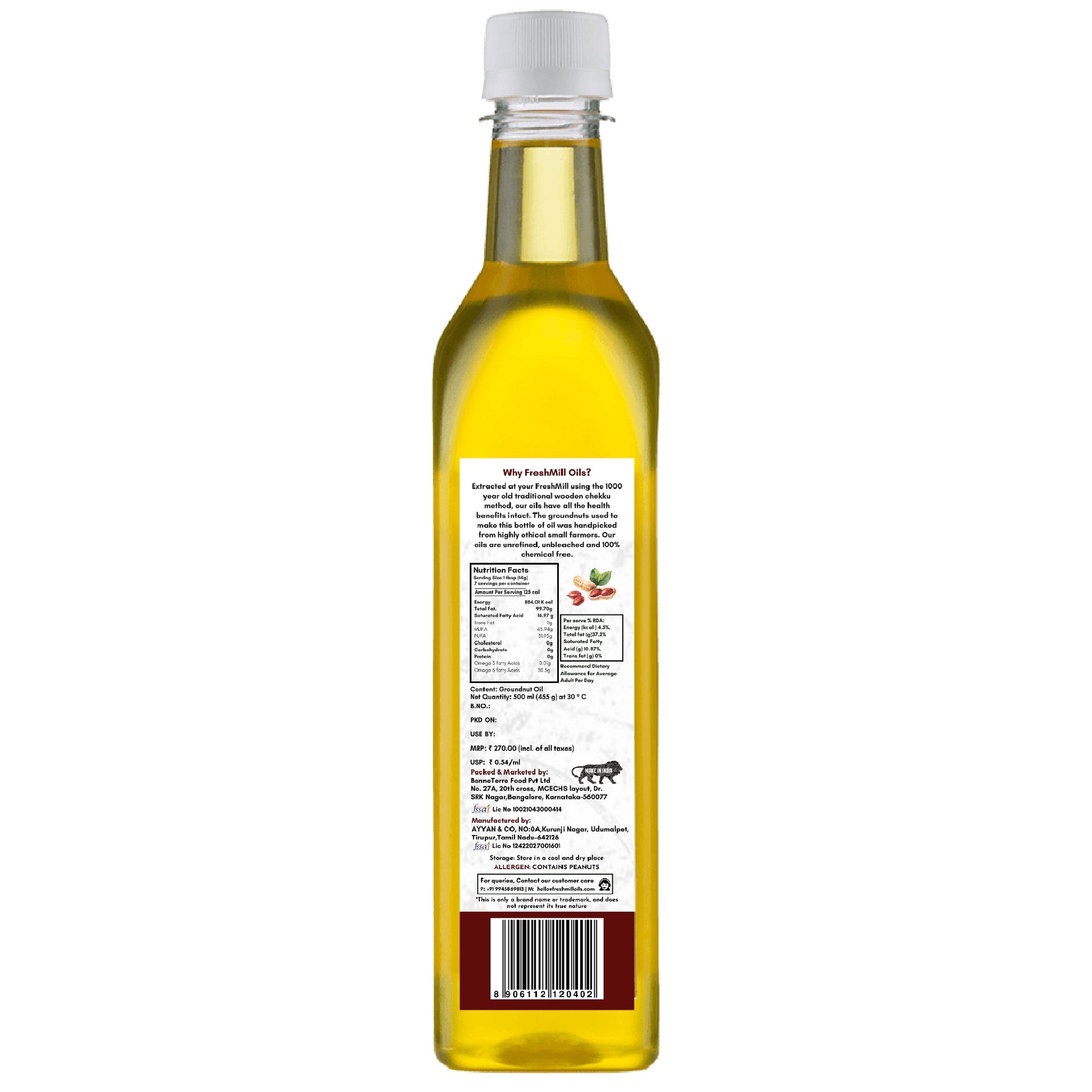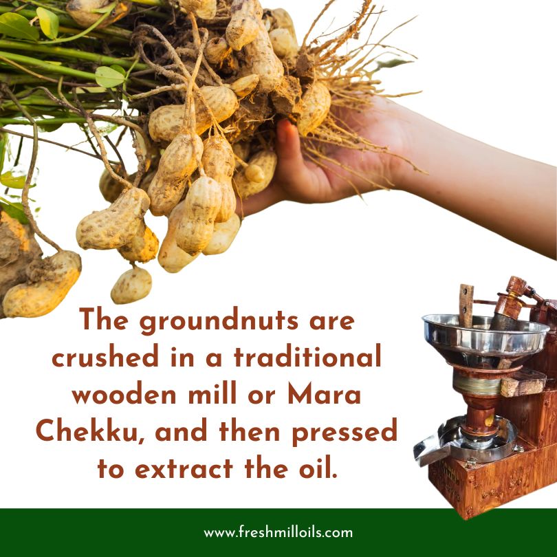 Real unrefined cold-pressed groundnut/peanut oil is extracted at your FreshMill using the traditional wooden mill (Kachi Ghani/ Mara Chekku) method where the oil is extracted without heating or any chemical processes. Groundnut oil that is extracted using traditional cold-pressed methods is highly nutritious and healthy with all the health benefits intact.