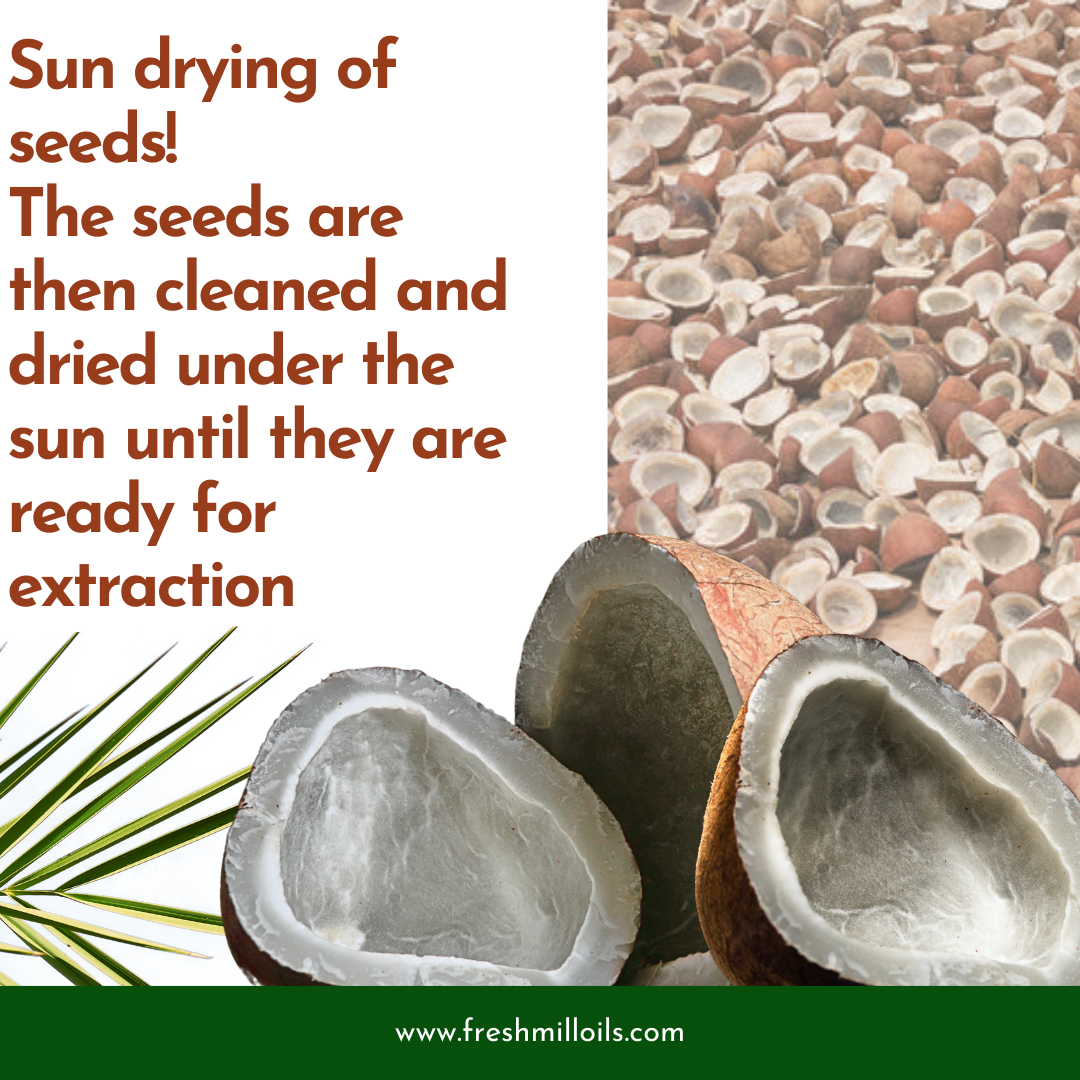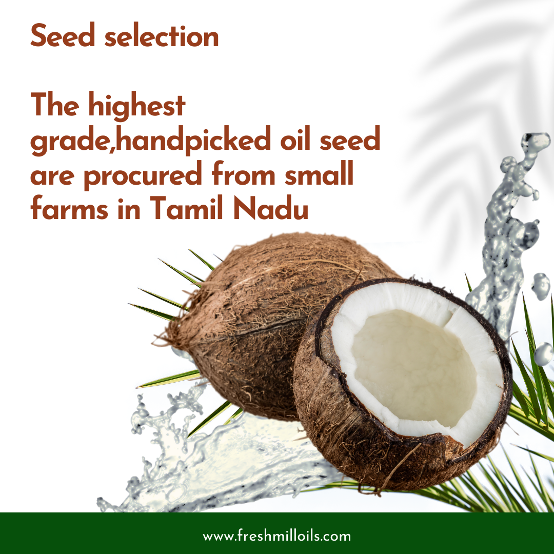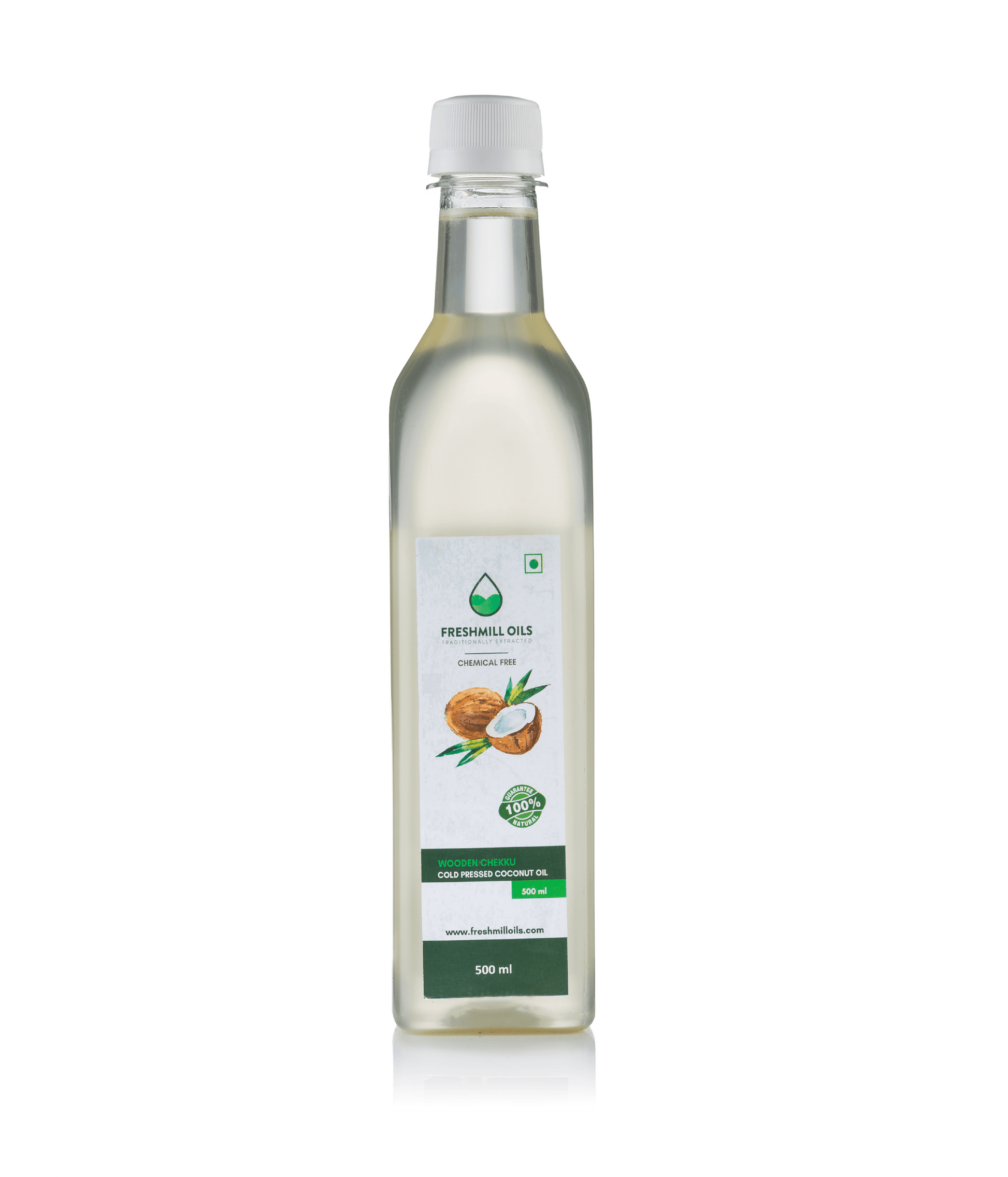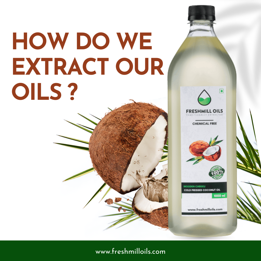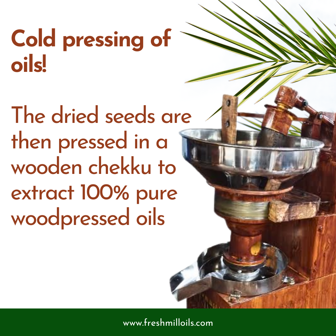 We at FreshMill oils bring you coconut oil straight from the coconuts without adding or removing anything from it. The process involves drying of the coconut cakes which are then pressing in a wooden mill. The pressing brings out the oil which is then filtered and bottled.
